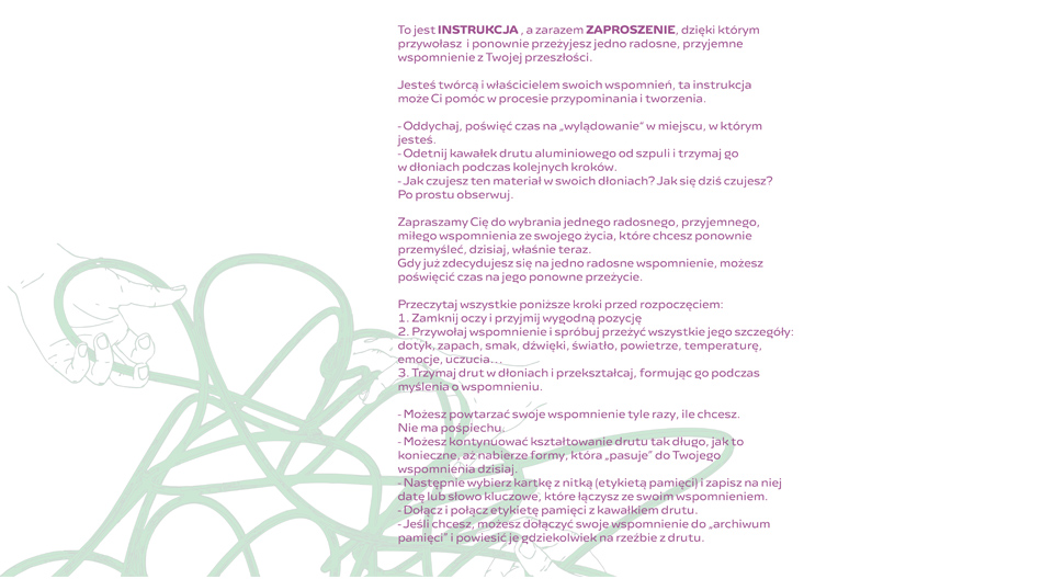 Wystawa angażuje odwiedzających do aktywowania zmysłu dotyku a jednocześnie do ponownego przeżywania / odzyskiwania radosnych wspomnień z przeszłości. Zwiedzający otrzymują plastyczny materiał, który mogą dowolnie przekształcać, przywołując w ciszy swoje wspomnienia. Jego giętkość sprawia, że