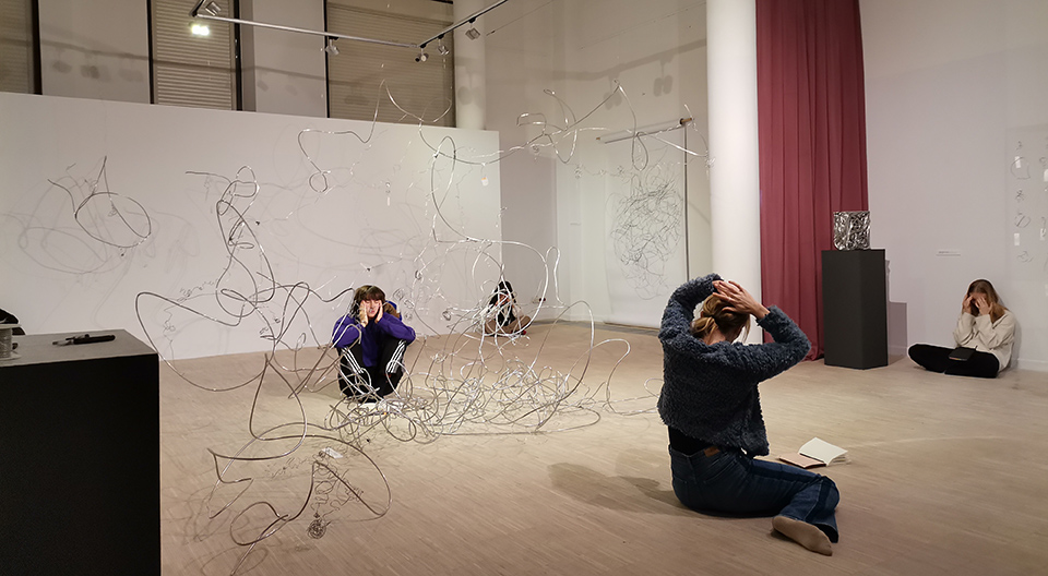 "Tracing Memories" is a participatory exhibition project by Jasmin Schaitl, with elements developed in collaboration with the participants from the "Tangible Practices" workshop. This exhibition lets us explore the complexities and potentialities of the sense of touch in connection with memory, reecting on human beings as individual vessels of recollections. With a distinctive and remarkable ability, referred to as mental-time-travel (coined by Endel Tulving), it encapsulates the human skill of navigating through the landscapes of the past and potential futures. When one consciously applies this skill, the effect of shaping present, past, and future experiences becomes more tangible. The exhibition engages visitors to activate their sense of touch and, simultaneously, relive and retrieve a past joyful memory of themselves. Visitors are provided with a malleable material that they can transform while remembering their memory in silence. This pliable material turns an ephemeral memory into a physical substance that can remain in the exhibition space. This process supports visitors in exploring the transformative power of the past on the present and their individual agency. It invites visitors to become active creators of their experience, perceiving the impact of joyful past experiences on their present state of mind. "Tracing Memories" is a further development of Schaitl's ongoing project "reciprocity" partially exhibited here. "reciprocity" consists of works displayed at Galerie Altán Klamovka in Prague in 2021, the rst participatory exhibition where visitors were invited to materialize their memories into malleable material. As in "Tracing Memories", visitors could place their materialized memories on an existing site-specic wire sculpture hanging in the space. To archive the exhibition, the artist carefully transferred the memories onto a separate surface to highlight them. She then drew the shadow of the sculpture and later pressed the site-specic aluminum sculpture into an archival cube shape. A document of this transformation is presented in the form of a video. The new collaborative work with participants of the "Tangible Practices" workshop is developed during the weekend prior to the opening. As a collective, the workshop group creates a site-specic environment, consisting of their translated and materialized memories from the workshop.
